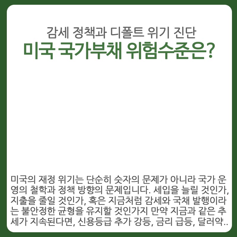 미국의 재정 위기는 단순히 숫자의 문제가 아니라 국가 운영의 철학과 정책 방향의 문제입니다. 세입을 늘릴 것인가, 지출을 줄일 것인가, 혹은 지금처럼 감세와 국채 발행이라는 불안정한 균형을 유지할 것인가지 만약 지금과 같은 추세가 지속된다면, 신용등급 추가 강등, 금리 급등, 달러 약세, 그리고 글로벌 금융시장의 불안정성으로 이어지는 복합 위기가 도래할 수 있습니다. 미국의 재정 상황은 더 이상 미국만의 문제가 아닙니다. 전 세계의 통화와 금융 시장이 미국 경제에 연결되어 있는 만큼, 그들이 내리는 결정 하나하나가 전 세계 경제에 파급 효과를 미치게 됩니다.