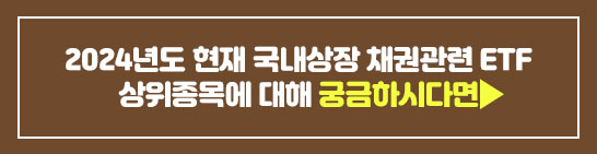 지난 포스팅에서 소개드린 국내상장 채권관련 ETF 중 2024년도 현재 상위 10위내에 진입해 있는 ETF 종류들에 대해 궁금하시다면 위의 링크를 클릭해 확인해 보시기 바랍니다.