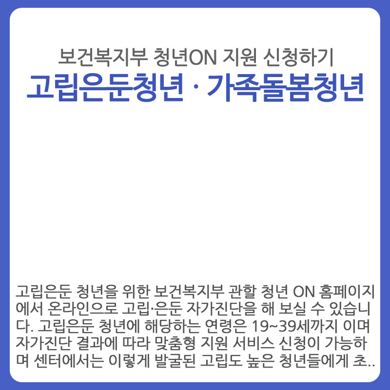 고립은둔 청년들 중에는 평범한 사람들 처럼 세상밖으로 다시 나오고 싶어 하는 청년들도 굉장히 많을 텐데요.. 하지만 어디서부터 고립에 갇혀 있는 문을 열고 나와야 할지 몰라 막막해하는 청년들이 스스로 편하게 도움을 요청할 수 있도록 지난 8월 14일부터 센터를 통해 상. 요청을 받고 있다고 합니다. 먼저 청년 스스로 자신의 심리적 상태가 어떠한지 객관적인 판단을 확인해 보아야 하는데요.. 고립은둔 청년을 위한 보건복지부 관할 청년 ON 홈페이지에서 온라인으로 고립·은둔 자가진단을 해 보실 수 있습니다. 고립은둔 청년에 해당하는 연령은 19~39세까지 이며 자가진단 결과에 따라 맞춤형 지원 서비스 신청이 가능하며 센터에서는 이렇게 발굴된 고립도 높은 청년들에게 초기 상. 을 진행하여 고립 위험이 높은 청년이 심적 안정을 찾을 수 있도록 지원 계획을 수립할 예정이라고 합니다.