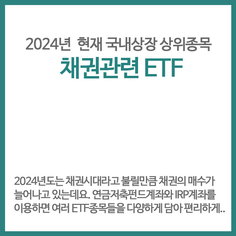 2024년도는 채권시대라고 불릴만큼 채권의 매.수가 늘어나고 있는데요. 연금저축펀드계좌와 IRP계좌를 이용하면 여러 ETF종목들을 다양하게 담아 편리하게 관리할 수 .있습니다. 올해는 채권형 ETF를 주목하라는 기사들도 여기 저기서 찾아 볼 수 있고.. 이제는 금.리가 내려갈 것이라는 기대심리 떄문인지 채권에 투.자하는 사람들도 꾸준히 늘어나고 있으며 현재 국내에 상장된 ETF TOP10 종목들 중에는 수익률이 훨씬 높은 나스닥 .ETF 상품이나 미국 S&P 500을 재치고 채권 관련 ETF의 매수량이 더욱 늘어나며 상위권을 포진해 가고 있는 추세입니다.