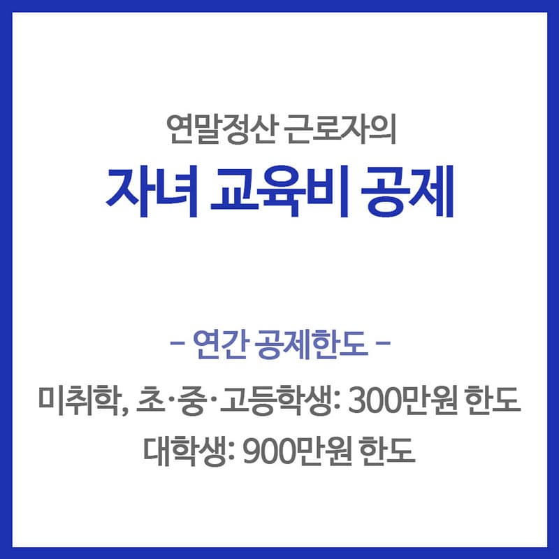 - 미취학 +초 + 중고등학생 300만원, 대학생 900만원, 한도없는 본인 .교육비 공제.