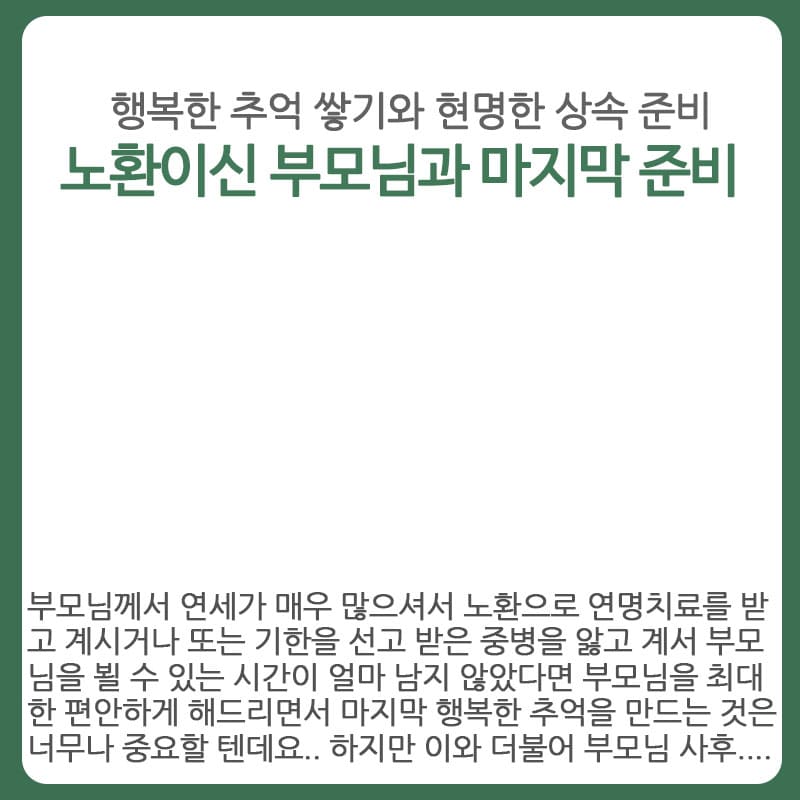 부모님께서 연세가 많으셔서 노환으로 연명치료를 받고 계시거나 또는 기한을 선고받은 중병을 앓고 계셔서 부모를 뵐 수 있는 시간이 얼마 남지 않았다면 부모님을 최대한 편안하게 해 드리면서 마지막 행복한 추억을 만드는 것은 너무나 중요할 것입니다.