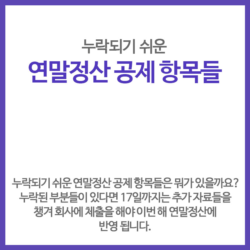 누락되기 쉬운 .연말정산 공.제 항목들은 뭐가 있을까요? 누락된 부분들이 있다면 내일(17일)까지는 추가 자료들을 챙겨 .회사에 체출을 해야 이번 해 연말정산에 반영 됩니다.