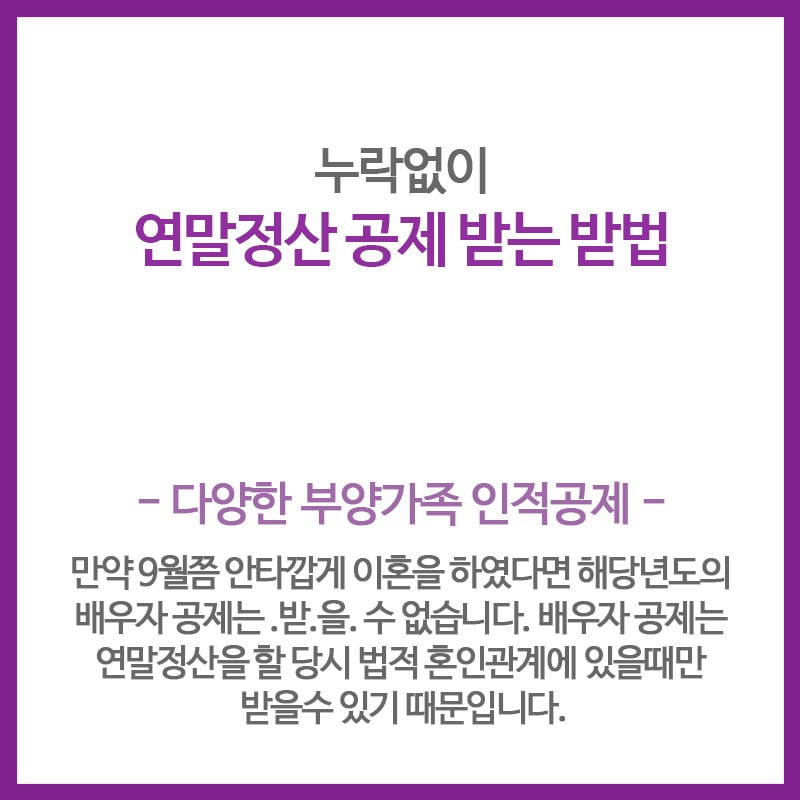 만약 9월쯤 안타깝게 이혼을 하였다면 해당년도의 배우자 공제는 .받.을. 수 없습니다. 배우자 공제는 연말정산을 할 당시 법적 혼인관계에 있을때만 받을수 있기 때문입니다. 이렇게 다양하게 직장인이 .연말정산 때 공제 .받.을. 수 있는 항목들에 대해 살펴 보았는데요.. 빠짐 없이 회사에 서류제출 잘 하시고 1월15일부터는 열람이 가능한 국세청 홈택스 .연말정산 간소화 서비스 또한 잘 검토 하셔서 혹시 누락된 부분이 있다면 수정도 잘 하시기 바랍니다.