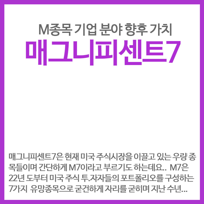 작년부터 매그니피센트7이라 불리우며 현재 미국 주식시장을 이끌고 있.는 우량 종목들을 간단하게 M7이라고 부르기도 하는데요.. M7은 22년도부터 미국 주식 투.자자들의 포트폴리오를 구성하는 .7가지 유망종목으로 굳건하게 자리를 굳히며 지난 수년 전과 마찬가지로 현재 미국주식 시장의 트렌드를 이끌어 가고 .있습니다.