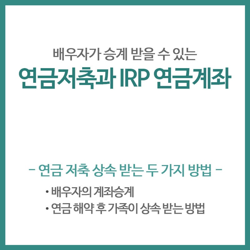 연금저축이나 IRP 연금계좌에 남아있는 금액은 가족 모두에게 상속이 가능하지만 연금계좌의 소유 자체를 .승계 받.을 수 있는 것은 배우자만이 가능합니다.