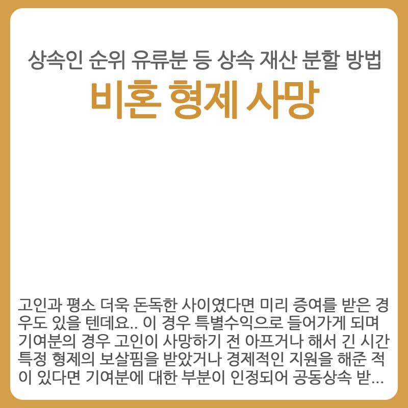 유언장이 없는 경우 상속순위에 해당하는 사람이 상속을 받게 되는데요.. 만약 형제가 받을 순위인데 형제자매들이 많다면 모두 공동상속인으로서 법정 상속 지분은 동일합니다.
