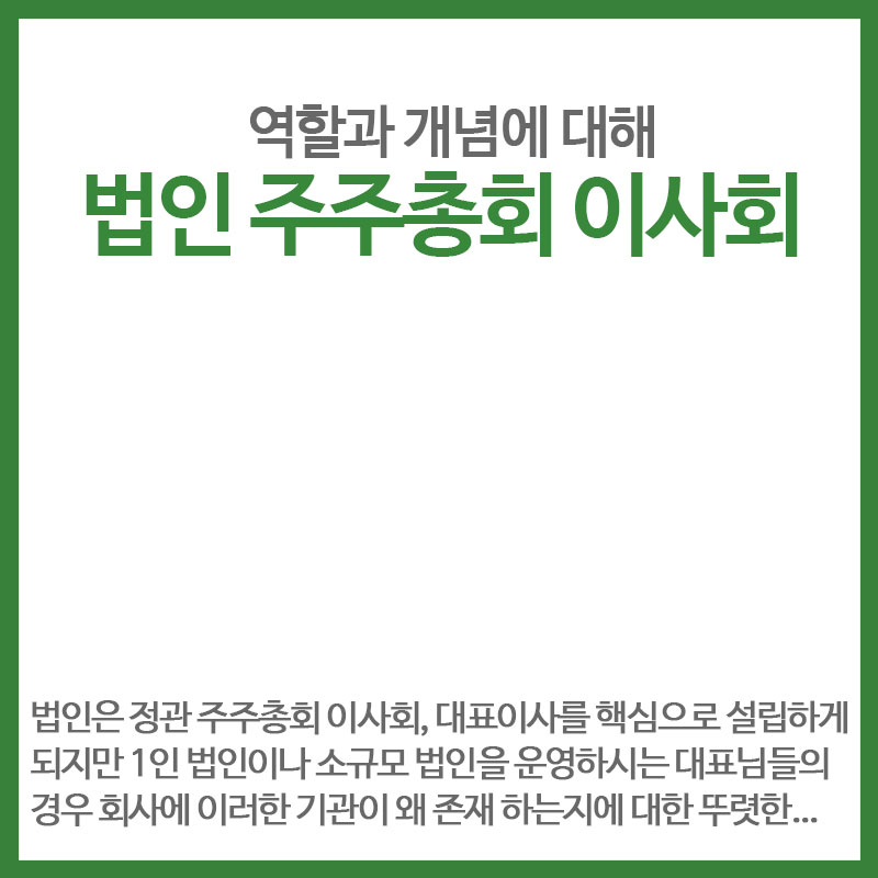 법인은 정관 주주총회 이사회, 대표이사를 핵심으로 설립하게 되지만 1인 법인이나 소규모 법인을 운영하시는 대표님들의 경우 회사에 이러한 기관이 왜 존재 하는지에 대한 뚜렷한 이유를 모르는 채 운영하시는 경우들도 꽤 많으신 것 같습니다. 하지만 기업에서 주주총회, 이사회등이 해야 하는 역할과 상관관계에 .대해 이해가 생기고 나면 향후. 회사를 운영함에 있어 기업이 향후 나아갈 뚜렷한 방향을 설계하는 데에 큰 도움을 받으실 수가 .있습니다. 그래서 오늘은 법인 경영과 운영에 필요한 핵심 기관들에 대한 개념에 .대해 알아 보겠습니다.