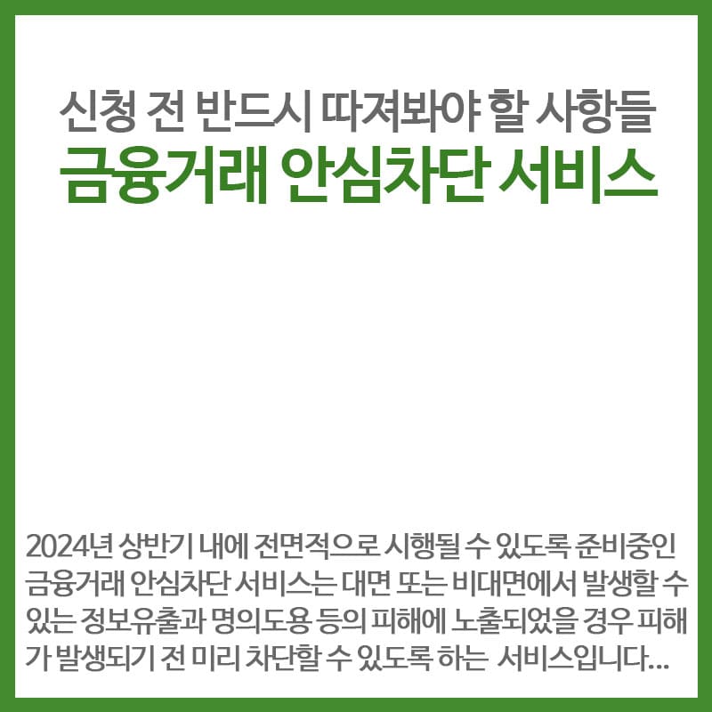 금융거래 안심차단 서비스는 2024년 상반기 내에 전면적으로 시행될 수 있도록 준비중인데요. 대면 또는 비대면에서 발생할 수 있는 정보유출과 명의도용 등의 피해에 노출되었을 경우 피패가 발생되기 전 미리 차단할 수 있도록 하는 서비스입니다. 다만 그냥 모두에게 제공되는 서비스는 아니며, 신청을 하셔야만 이용가능한 서비스인데요.. 본인이 평소 거래 중인 금융회사에 방문하셔서 금융거래 안심차단 서비스 신청을 하시면 됩니다.
