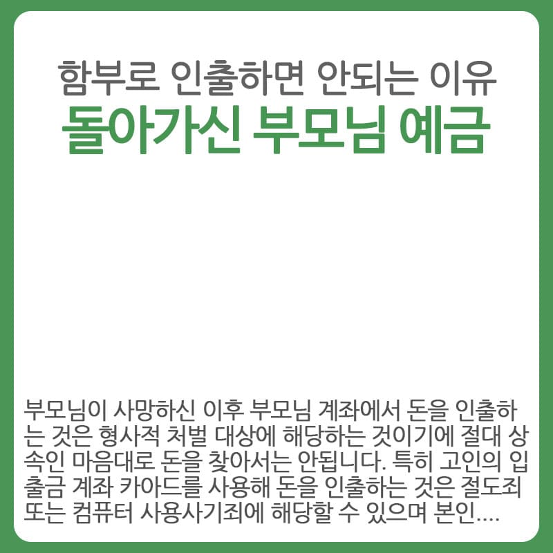 하지만 사망자 재산인 금융재산을 본인 재산처럼 찾아서는 안됩니다. 아무리 나의 부모님이라고 해도 부모님이 사망하신 이후 부모님 계좌에서 돈을 인출하는 것은 형사적 처벌 대상에 해당하는 것이기에 절대 상속인 마음대로 돈을 찾아서는 안됩니다. 특히 고인의 입출금 계좌 카아드를 사용해 돈을 인출하는 것은 절도죄 또는 컴퓨터 사용사기죄에 해당할 수 있으며 본인의 부모님이라고 마치 자신이 부모님인 것처럼 은행에 방문해서 돈을 인출하는 것은 사망자의 명의를 도용한 것으로 간주되어 횡령이나 사기죄 처벌 대상이 될 수 있습니다.