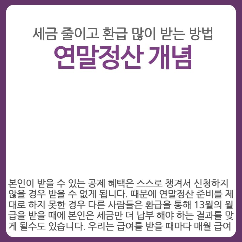 본인이 받을 수 있는 공제 혜택은 스스로 챙겨서 신청하지 않을 경우 받을 수 없게 됩니다. 때문에 연말정산 준비를 제대로 하지 못한 경우 다른 사람들은 환급을 통해 13월의 월급을 받을 때에 본인은 세금만 더 납부 해야 하는 결과를 맞게 될 수도 있습니다.