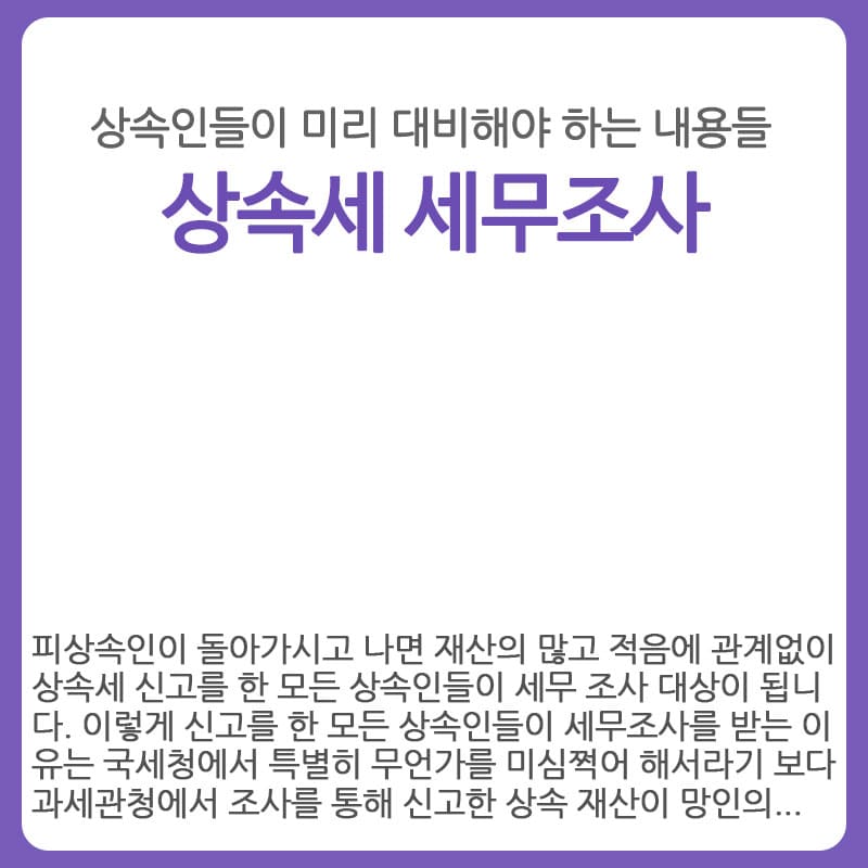 상속세 세무조사를 받게 되는 대상은 누구일까요? 부모님 등 피상속인이 돌아가신 후 상속 절차가 시작되면 혹시나 실수가 발생하지 않도록 주의가 필요한 부분들이 많지만 고인이 돌아가신 후 6개월까지 상속세 신고를 마쳐야 하는 것은 물론 상속세 세무조사 준비도 필요해서 상속인들은 슬픈 와중에서도 챙겨야 할 것들이 많아 더욱 힘든 시간을 보내게 될 것 같습니다. 오늘은 상속인들이 미리 준비해야 하는 상속세 세무조사와 관련된 내용에 대해 알아보겠습니다.