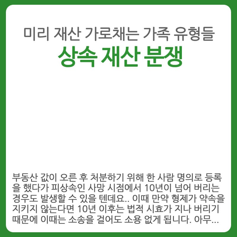 부동산 값이 오른 후 처분하기 위해 한 사람 명의로 등록을 했다가 피상속인 사망 시점에서 10년이 넘어 버리는 경우도 발생할 수 있을 텐데요.. 이때 만약 형제가 약속을 지키지 않는다면 10년 이후는 법적 시효가 지나 버리기 때문에 이때는 소송을 걸어도 소용 없게 됩니다. 아무리 좋은 형제라고 해도 10년이라는 긴 시간 동안 예측하지 못한 많은 일들이 생길 수 있기에 이러한 재산 분할은 응하시지 않아야 합니다. 또한 상속세는 공동상속이나 한 사람이 상속받는 것이나 상속세 세금은 전혀 차이가 없기에 이런 말도 안 되는 주장에 넘어가서 인감도장이나 인감증명서를 넘기시는 일이 절대 없도록 해야 합니다.
