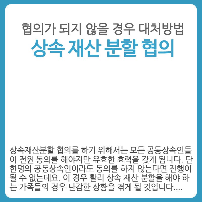 (*가족 간 협의가 완만하지 안거나 평소에도 의견이 잘 맞지 않았다면 가족 간 협의를 진행하기 전에 상속 전문 변호사 분의 조언을 먼저 듣고 가족 간 회의에 참여하시는 것이 모르고 응할 수 있는 실수를 줄이실 수 있는 방법입니다.)