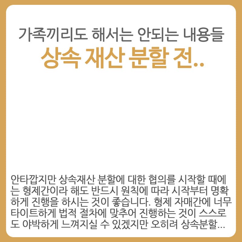 안타깝지만 상속재산 분할에 대한 협의를 시작할 때에는 형제간이라 해도 반드시 원칙에 따라 시작부터 명확하게 진행을 하시는 것이 좋습니다. 형제 자매간에 너무 타이트하게 법적 절차에 맞추어 진행하는 것이 스스로도 야박하게 느껴지실 수 있겠지만 오히려 상속분할이 끝난 이후에도 가족끼리 원만하게 좋은 관계를 유지하기 위해서는 누구도 섭섭한 쪽이 생기지 않도록 공평하게 상속이 진행되는 것이 좋습니다.