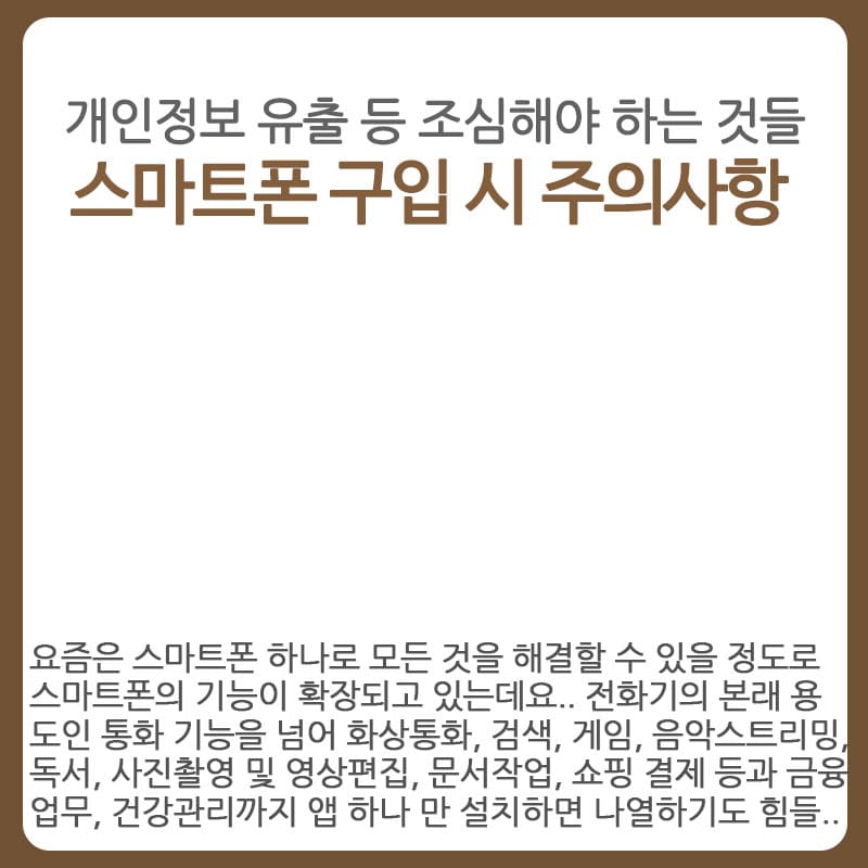 휴대폰에는 누군가와 개인적인 카톡, 문자를 주고 받은 내용이나 개인적으로만 소장하고 싶은 사진 영상 등을 저장해 놓은 사생활적인 내용들이 많이 보관되어 있을 텐데요.. 하지만 이전에 사용하던 폰에서 새로 구입한 스마트폰으로 자료를 옮겨 주는 척하면서 사진, 영상, 금융 정보 등을 빼가는 경우들도 있었습니다. 범죄에 악용하게 될 경우 피해가 무척 커질 수 있기에 조심하셔야 합니다. 요즘은 개인정보 탈취가 우려되거나 좀 더 값싼 기기를 구입하고 싶을 때.. 또는 매장에서 제공받는 초기 세팅등의 서비스 비용을 제외하고 싶은 경우 자급제 폰을 구입해서 사용하시는 분들도 많으신데요.. 사실 새 스마트폰을 구입한 경우에도 요즘은 인터넷 검색을 통해 초기 세팅을 하고 기존 스마트폰의 사진 등 자료는 새 스마트폰을 사면 들어있는 'usb 데이터 케이블' 선을 연결해서 아주 쉽게 새 휴대폰의 개통과 자료 전송을 할 수가 있는데요.. 하지만 그럼에도 스스로 하기에 좀 귀찮거나 어렵게 느껴지는 경우에는 휴대폰 매장을 통해 구입하시는 것이 좋습니다.
