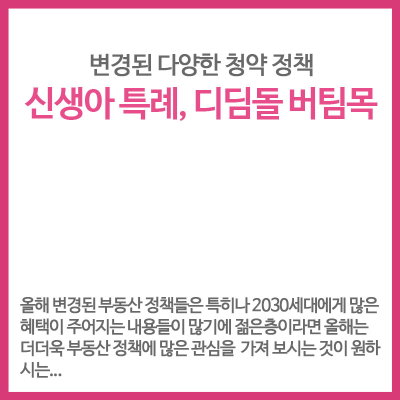오늘은 올해부터 변경된 주요 부동산 정책들에 대해 살펴 보겠습니다. 올해 변경된 부동산 정책들은 특히나 2030세대에게 많은 혜택이 주어지는 내용들이 많기에 젊은층이라면 올해는 더더욱 부동산 정책에 많은 관심을 가져 보시는 것이 원하시는 좋은 혜택들을 알차게 누리시는 데 큰 도움이 될 수 있을 것 같습니다.