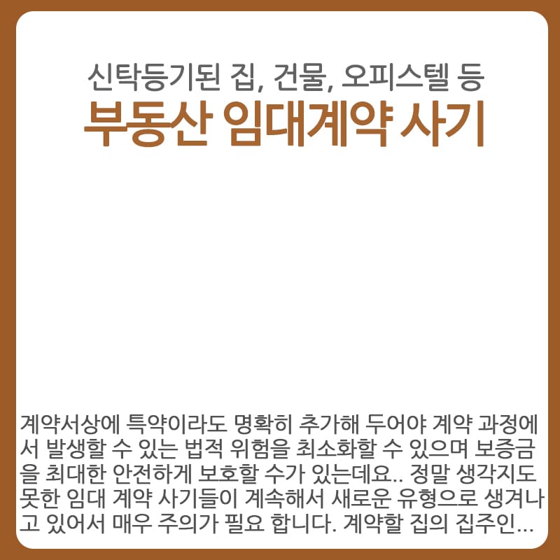계약서에는 신탁 회사의 동의를 받지 않으면 계약이 무효가 된다는 내용도 추가하는 것이 좋습니다. 신탁 회사의 동의를 받아야만, 세입자가 신탁 회사와 법적으로 유효한 계약을 체결할 수 있기 때문입니다. 계약서상에 특약이라도 명확히 추가해 두어야 계약 과정에서 발생할 수 있는 법적 위험을 최소화할 수 있으며 보증금을 최대한 안전하게 보호할 수가 있는데요.. 정말 생각지도 못한 임대 계약 사기들이 계속해서 새로운 유형으로 생겨나고 있어서 매우 주의가 필요합니다.