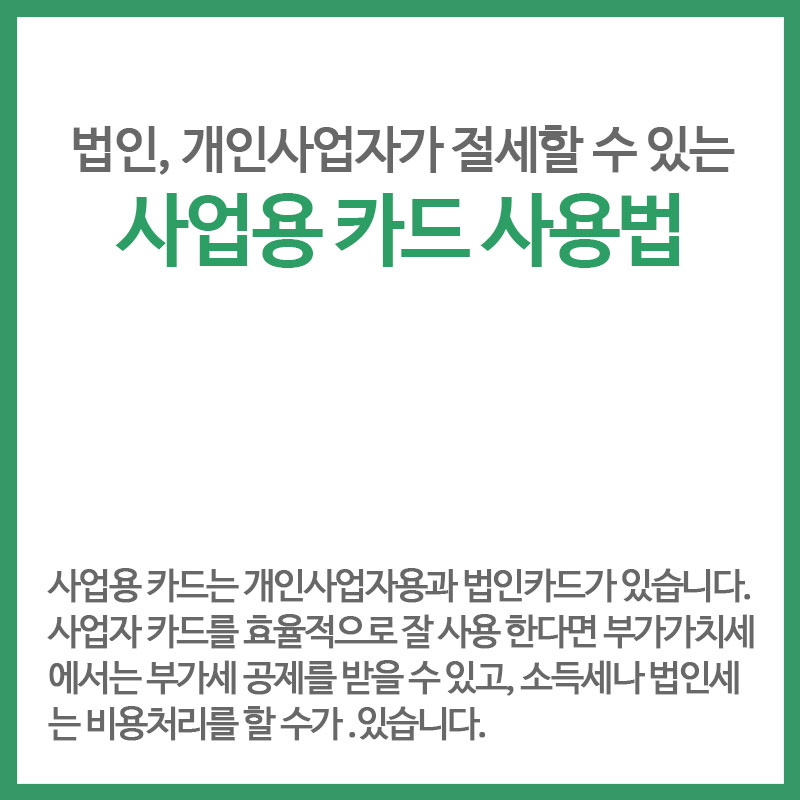 사업용 카.드는 개인사업자용과 법인카.드가 .있습니다. 사업자 카.드를 효율적으로 잘 사용한다면 부가가치세에서는 부가세 공제를 .받을 수 있고 소득세나 법인세는 비용처리를 할 수가 .있습니다.
