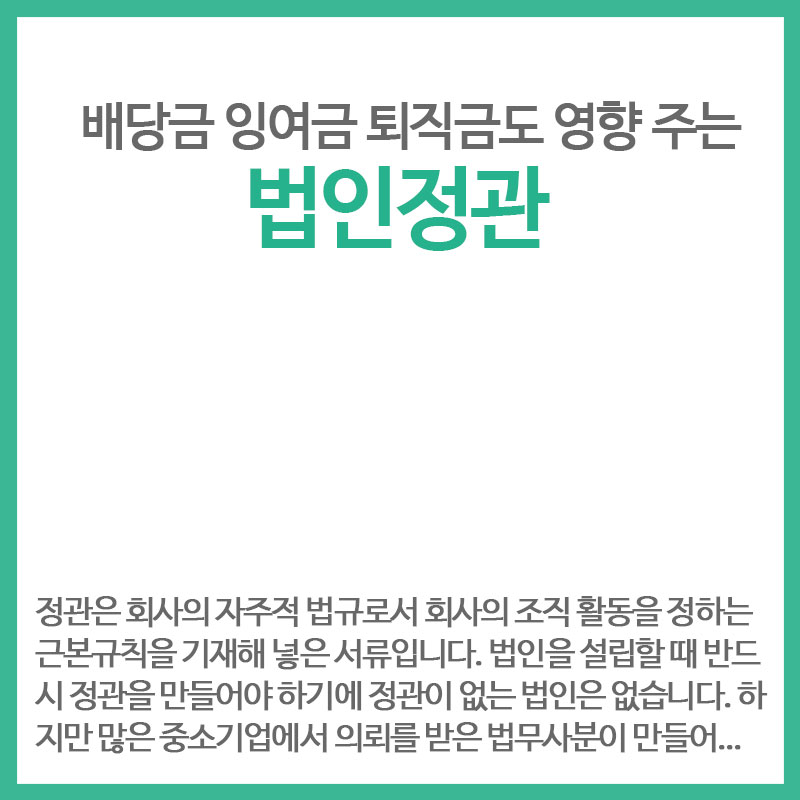 정관은 회사의 자주적 법규로서 회사의 조직 활동을 정하는 근본규칙을 기재해 넣은 서류입니다. 법인을 설립할 때 반드시 정관을 만들어야 하기에 정관이 없는 법인은 없습니다. 하지만 많은 중소기업에서 의뢰를 받은 법무사분이 만들어 놓은 정관을 형식적으로만 가지고 .있는 곳들도 많아 정관의 구체적인 존재 이유를 알지 못한채 처음 만들어 놓은대로 법인정관변경 없이 방치하고 .있는 중소기업들도 꽤 많이 있습니다.