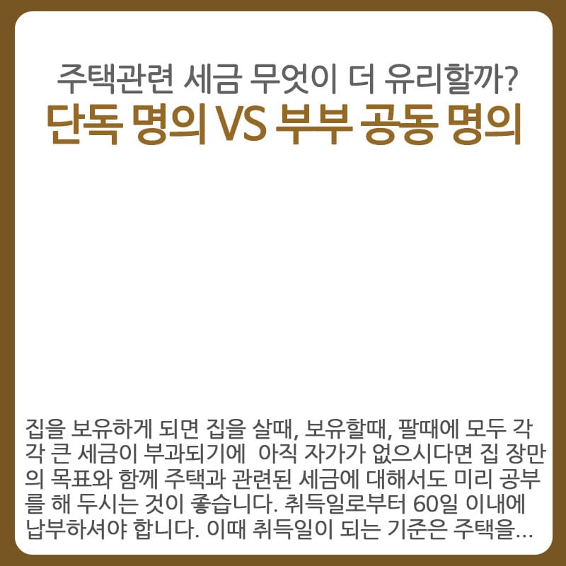 집을 보유하게 되면 집을 살때, 보유할때, 팔때에 모두 각각 큰 세금이 부과되기에 아직 자가가 없으시다면 집 장만의 목표와 함께 주택과 관련된 세금에 대해서도 미리 공부를 해 두시는 것이 좋습니다. 오늘은 주택과 관련된 세금에 대해 알아 보면서 부동산 세금을 아끼려면 단독 명의로 하는 것이 좋을지 아니면 부부 공동 명의로 하는 것이 좋은지에 대해 알아 보겠습니다.