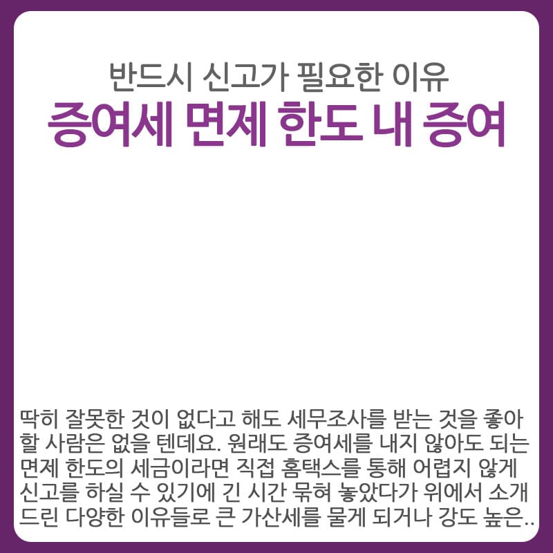 하지만 증여세가 면제되는 금액 안에서 증여가 있었던 경우 이걸 꼭 신고를 해야 하는지에 대한 의문이 드실 것 같은데요.. 오늘은 면제한도 내에서 이루어진 증여세도 반드시 신고가 필요한 이유에 대해 알아보겠습니다.