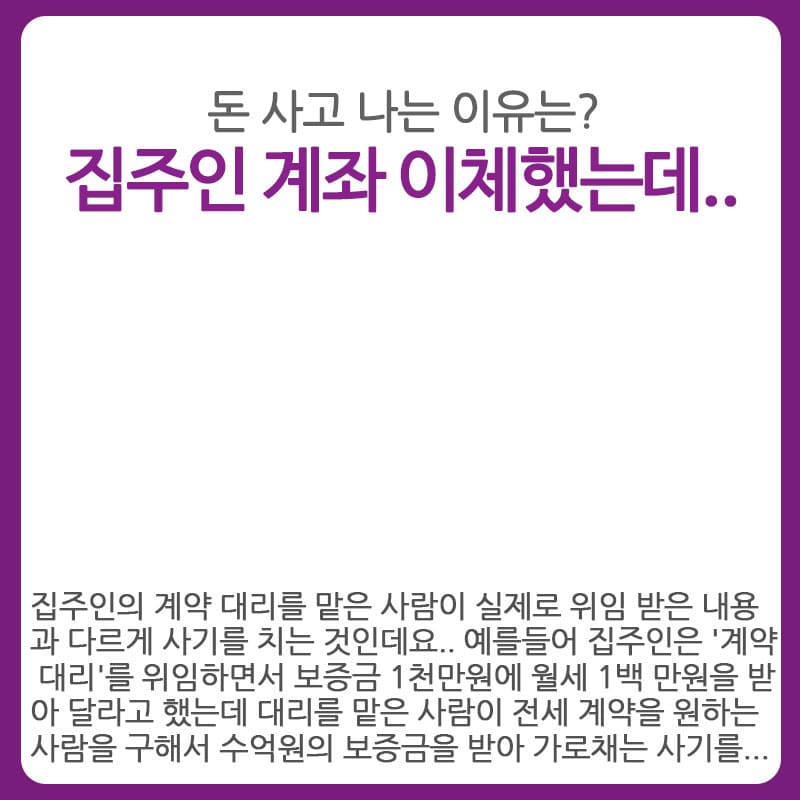 집주인의 계약 대리를 맡은 공인중개사가 실제로 위임받은 내용과 다르게 사기를 치는 것인데요.. 예를 들어 집주인은 '계약 대리'를 위임하면서 보증금 1천만 원에 월세 1백만 원을 받아 달라고 했는데 대리를 맡은 사람이 전세 계약을 원하는 사람을 구해서 수억 원의 보증금을 받아 가로채는 사기를 치는 것입니다.. 전세를 구하는 세입자가 집주인과의 직접 통화를 해 보며 계약 내용이 전세 계약임을 확인했다고 해도 이는 이미 계약 대리인이 다 속임수를 기획해 놓은 상태일 것입니다.