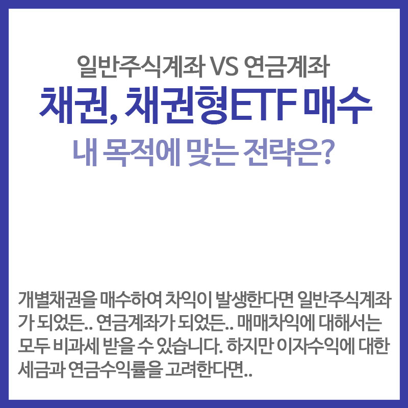 따라서 개별채권을 매수하실 때 절세를 중심으로 선택을 한다면 매매차익에 대해 5.5%나 연금 소득세를 물어야 하는 연금계좌보다 ISA계좌나 일반계좌로 매수를 하여 투.자를 하는 방법이 더 유리할테고 채권형 ETF 같은 펀드상품은 연금계좌로 운용을 하시는 것이 절세에 더 유리한 결과를 보실 수 있습니다.