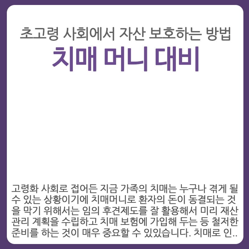 누구나 나이를 먹게 되고 치매는 예상하지 못한 상황에서 발생할 수 있을 텐데요.. 때문에 재산이 많으신 분들일수록 더욱더 치매를 대비한 후견인 지정, 보험 가입 등을 해 두시는 것이 중요합니다.