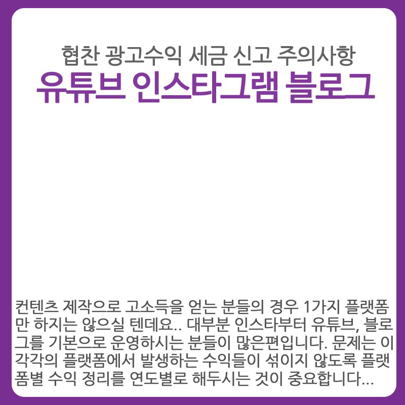 조회수가 많이 나오는 플랫폼 운영자의 경우 영상 콘텐츠, 제품 리뷰, 공구(공동구매), 광고 협찬, 팬 후원 등 수익 형태도 매우 다양한 것으로 알려져 있습니다. 하지만 이렇게 다양한 수익을 벌어들이는 만큼 관련된 세금에 대해서도 매우 꼼꼼하게 알고 계시는 것이 필요한데요.. 오늘은 플랫폼 운영자, 고수익자 인플루언서 분들은 세금신고를 어떻게 해야 하는지에 대해 알아보겠습니다.