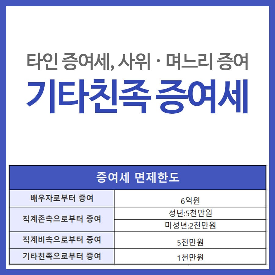 기타친족이라면 부모님의 형제인 삼촌, 이모, 고모 같은 분들이 가.장 먼저 떠오를텐데요.. 기타친족의 경우 10년동안 1천만원의 .증여 공제를 받을 수 있습니다. 이렇게 증여. 공제를 받을 수 .있는 범위의 기타친족은 4촌이내의 인척과 6촌 이내의 방계혈족까지가 증여공제를 받을 수 있는 기타친족에 포함됩니다. 시부모님이나 정인, 장모님, 그리고 사위 며느리는 혼인으로 맺어진 4촌이내의 인척이기에 1천만원 공제를 받을 수 있는 기타친족이 됩니다.