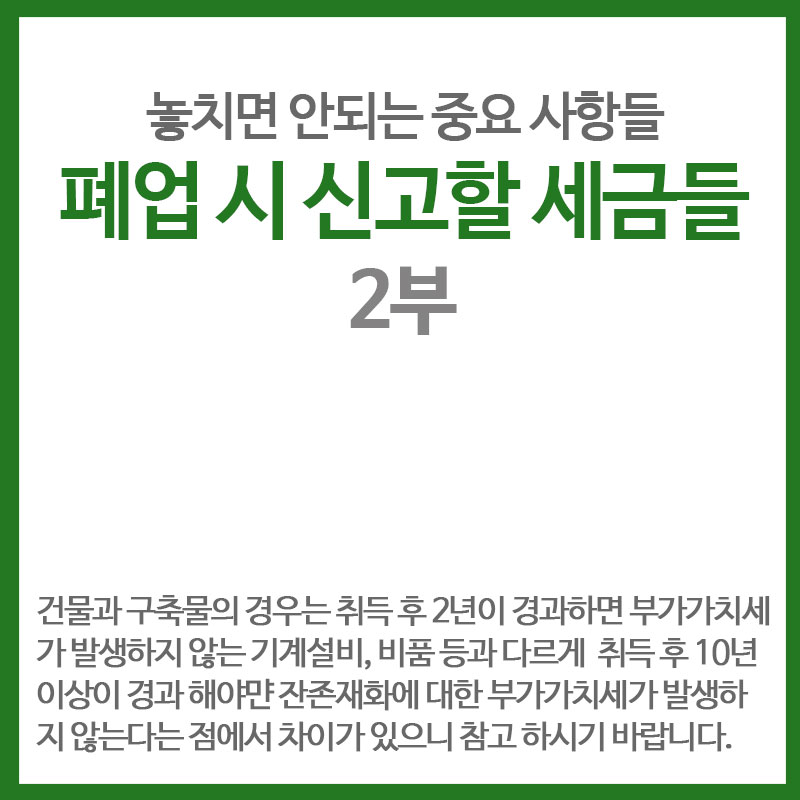 건물과 구축물의 경우는 취득 후 2년이 경과하면 부가가치세가 발생하지 않는 기계설비, 비품 등과 다르게 취득 후 10년 이상이 경과 해야먄 잔존재화에 .대한 부가가치세가 발생하지 않는다는 점에서 차이가 있으니 참고 하시기 바랍니다.