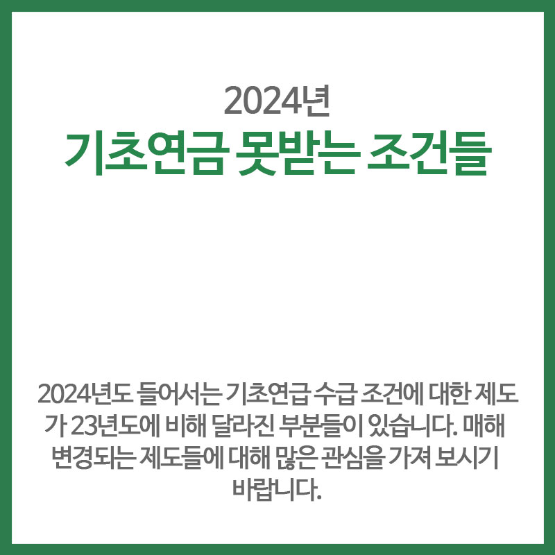 하지만 기초연금은 연령이 되었다고 해서 알아서 챙겨주는 제도가 아니며 본인의 신청에 의해 수급자격이 주어집니다. 재산이 있어도 수급권자가 될 수 있으며, 일단 신청을 해야 본인이 자격이 되는지.. 되지 않는지를 정확히 확인하실 수 있습니다. 또한 매해 제도가 개선되기에 작년에 탈락했다고 올해도 탈락되는 것은 아닙니다. 그러면 오늘은 기초연금을. 받을. 수 없는 조건들에 대해 살펴 보겠습니다.