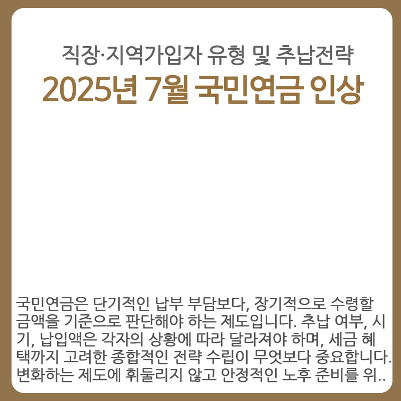 2025년은 국민연금 추납 전략을 재정비해야 할 해입니다. 보험료율 인상과 소득 상한 조정이라는 두 가지 변화가 동시에 예정되어 있기 때문에, 다음과 같은 전략을 추천합니다.