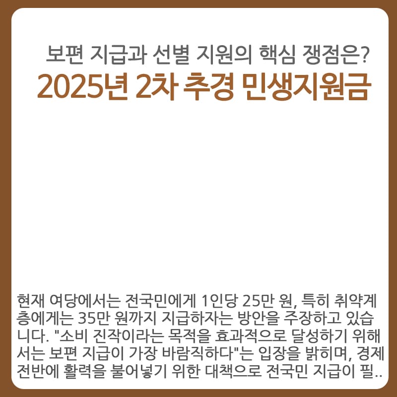 2025년, 제21대 정부가 추진 중인 2차 추가경정예산안(2차 추경)의 핵심은 ‘민생 회복 지원금’입니다. 하지만 이 지원금을 둘러싼 지급 방식에 대해 정치권과 전문가 사이에서의 치열한 논의가 이어지고 있는데요.