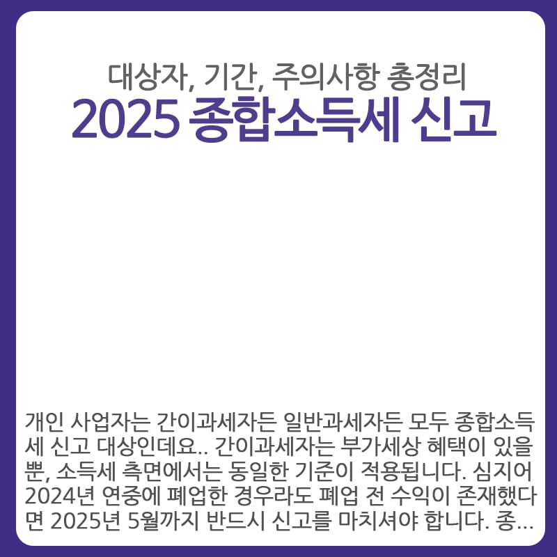 개인 사업자는 간이과세자든 일반과세자든 모두 종합소득세 신고 대상인데요.. 간이과세자는 부가세상 혜택이 있을 뿐, 소득세 측면에서는 동일한 기준이 적용됩니다. 심지어 2024년 연중에 폐업한 경우라도 폐업 전 수익이 존재했다면 2025년 5월까지 반드시 신고를 마치셔야 합니다.