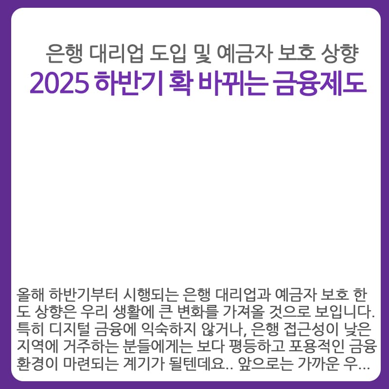 하지만 주의할 점도 있습니다. 모든 금융상품이 예금자 보호 대상은 아닙니다. 펀드, 채권, 양도성 예금증서(CD), 확정급여형 퇴직연금 등은 보호 대상에서 제외됩니다. 예금자 보호는 기본적으로 정기예금, 적금 등 안전 자산 중심이며, 반드시 상품 가입 전 '예금자 보호 대상 여부'를 꼼꼼히 확인해야 합니다. 일반적인 은행 상품이라고 해서 모두 보호 대상이라고 생각하면 안 됩니다. 올해 하반기부터 시행되는 은행 대리업과 예금자 보호 한도 상향은 우리 생활에 큰 변화를 가져올 것으로 보입니다. 특히 디지털 금융에 익숙하지 않거나, 은행 접근성이 낮은 지역에 거주하는 분들에게는 보다 평등하고 포용적인 금융 환경이 마련되는 계기가 될 텐데요.. 앞으로는 가까운 우체국이나 복지관, 편의점에서 기본적인 금융 업무를 처리할 수 있으며, 예금도 더 넓은 금액까지 보호받을 수 있게 되는 만큼, 변경 사항을 정확히 이해하고 현명하게 대응하시기 바랍니다.