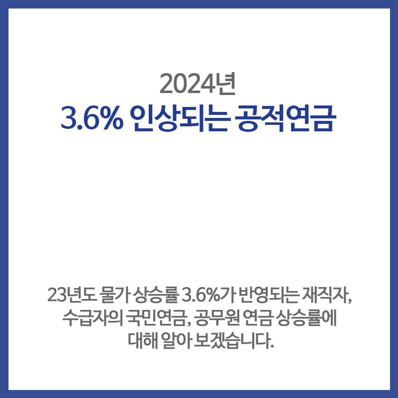 2024년이 시작된지 벌써 4일이 지났는데요.. 올해는 지난해에 비해 3.6%의 공적 연금이 상승된다는 반가운 소식이 있습니다.~ 국가가 운영하는 공적연금은 국가나 사회에 이바지하거나 일정기간 근무한 사람들의 노후생활을 보.장하기 위해 지급하는 연금제도인데요.. 우리나라에는 4대 공적연금이 있으며, 국민연금, 공무원연금, 사학연금, 군인연금이 있습니다. 오늘은 공적 연금 중에서 국민연금과 공무원연금의 수급자에게 적용되는 상승분과 .재직자의 상승분에 대해 .살펴 보겠습니다.