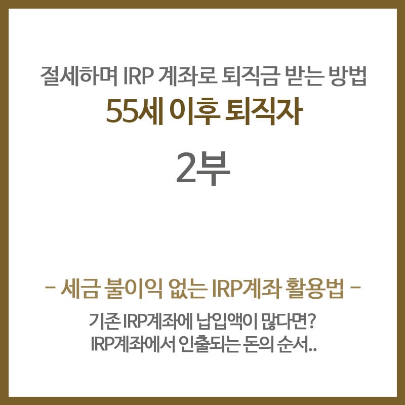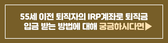 오늘은 55세 이후 퇴직자가 세금 불이익 없이 IRP계좌를 통해 퇴직금을 입금 받는 방법에 대해 살펴 보았는데요.. 지난 포스팅에서 소개드린 55세 이전 퇴직자의 IRP계좌로 퇴직금을 입금 받는 방법에 대한 내용이 궁금하시다면 위의 링크를 통해 확인해 보시기 바랍니다.