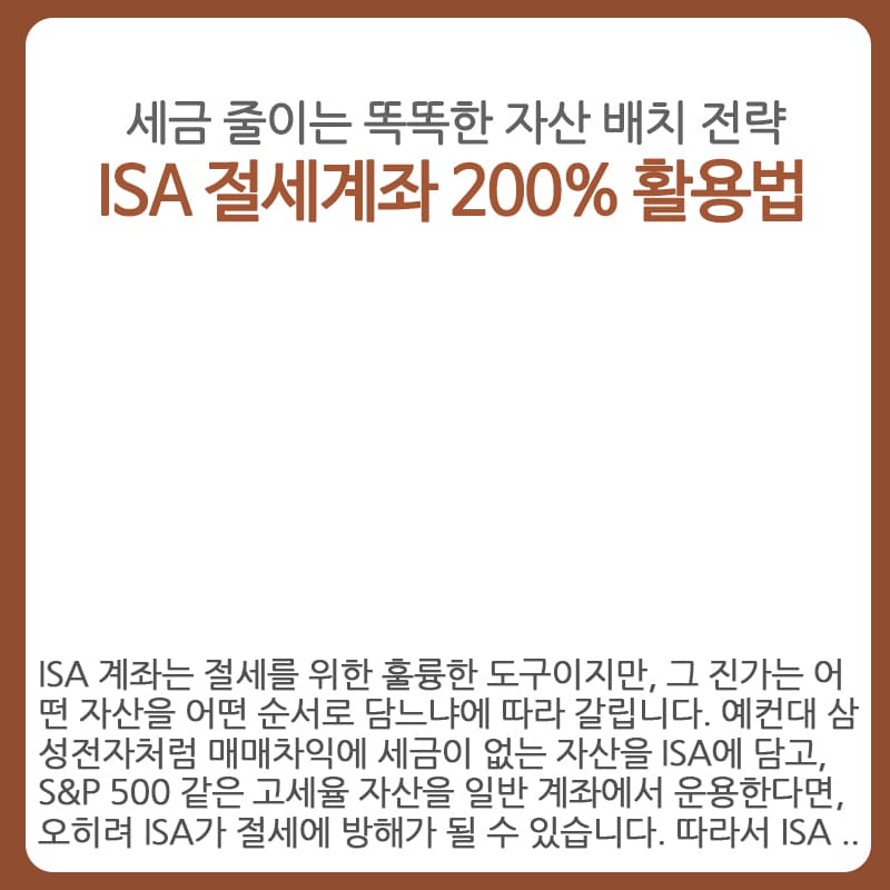 ISA 계좌는 절세를 위한 훌륭한 도구이지만, 그 진가는 어떤 자산을 어떤 순서로 담느냐에 따라 갈립니다. 예컨대 삼성전자처럼 매매차익에 세금이 없는 자산을 ISA에 담고, S&P 500 같은 고세율 자산을 일반 계좌에서 운용한다면, 오히려 ISA가 절세에 방해가 될 수 있습니다. 따라서 ISA 계좌를 효과적으로 활용하려면 세금 부담이 큰 자산부터 우선 배치하는 전략적인 설계가 반드시 필요합니다. 단순히 가입하는 데서 끝내지 말고, 매년 투자 계획을 점검하며 최대 절세 혜택을 누릴 수 있도록 설계해 보시기 바랍니다.